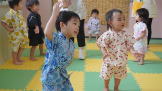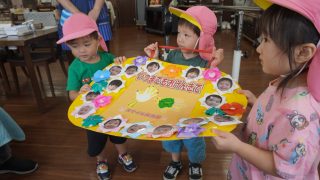 ブログ 「いらっしゃいませ~❣❣」 輪投げもできますよ~(^^♪お誕生会の後は、夏まつりのお店が開店!🎇ぼくが作った物も並んでいたよ🍧「イカくださ~い」「はいどうぞ」…(^^)/盆踊りもノリノリ、るんるん😃楽しさではじけていました!(^^)! 2025.08.08 ブログ